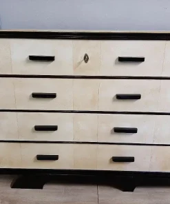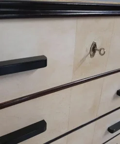 note: como cassettiera periodo tardo art decò italiano del 1940-50 circa con 4 cassetti e sportello laterale , elegantemente rifinito in noce ebanizzata e pergamena, maniglie in legno nero. Lo sportello decorato non è stampato ma è proprio dipinto sul legno.
