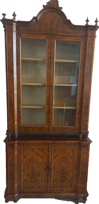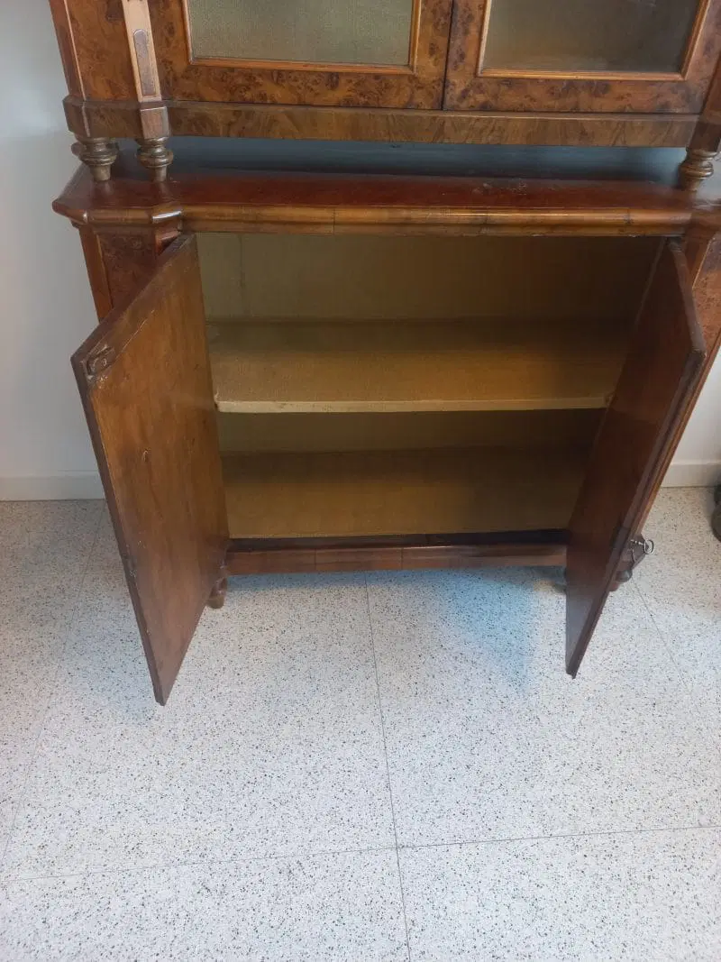 Bella credenza vetrina a 2 corpi in radica.Databile alla seconda metà del secolo xix, si presenta in perfette condizioni,parte interna rivestita con tessuto.trasporto da concordare.