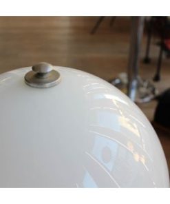 La struttura è composta da due elementi in vetro soffiato, uno arancione nella parte inferiore e uno bianco opalino nella parte superiore, separati da un elegante anello in acciaio cromato. La combinazione cromatica, vivace ma bilanciata, crea un forte contrasto visivo, enfatizzando le forme morbide e arrotondate della lampada.