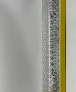 Armatura in metallo opaco, sfumature ottone, marmo. Diffusore di due tipologie: vetro ondulato e acrilico bianco opaco. Sorgente luminosa striscia a LED, temperatura 3000K.