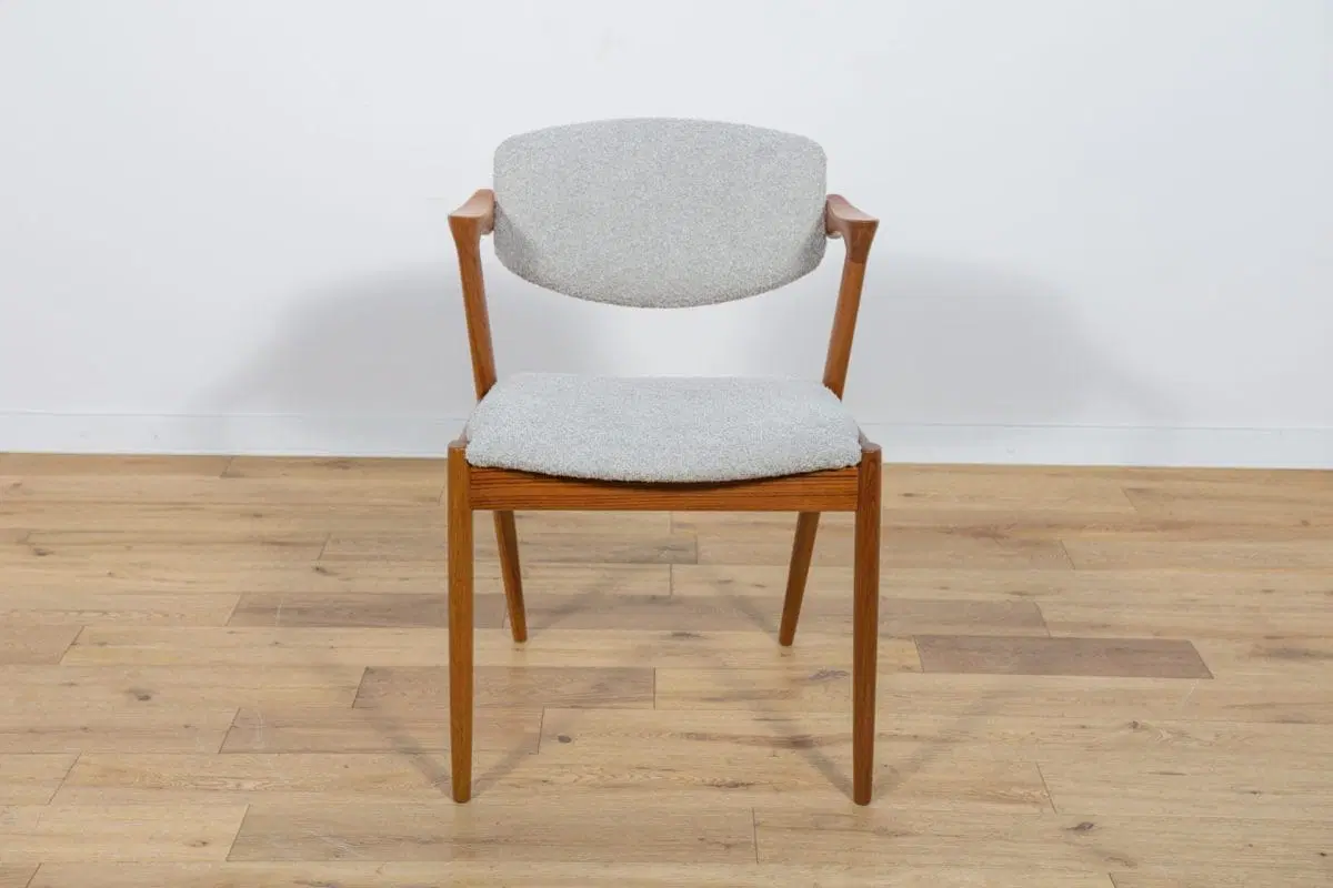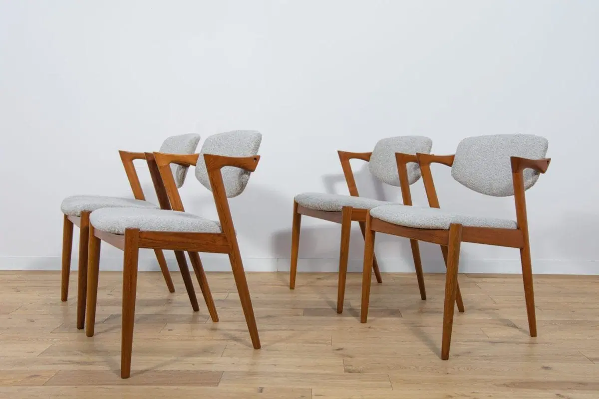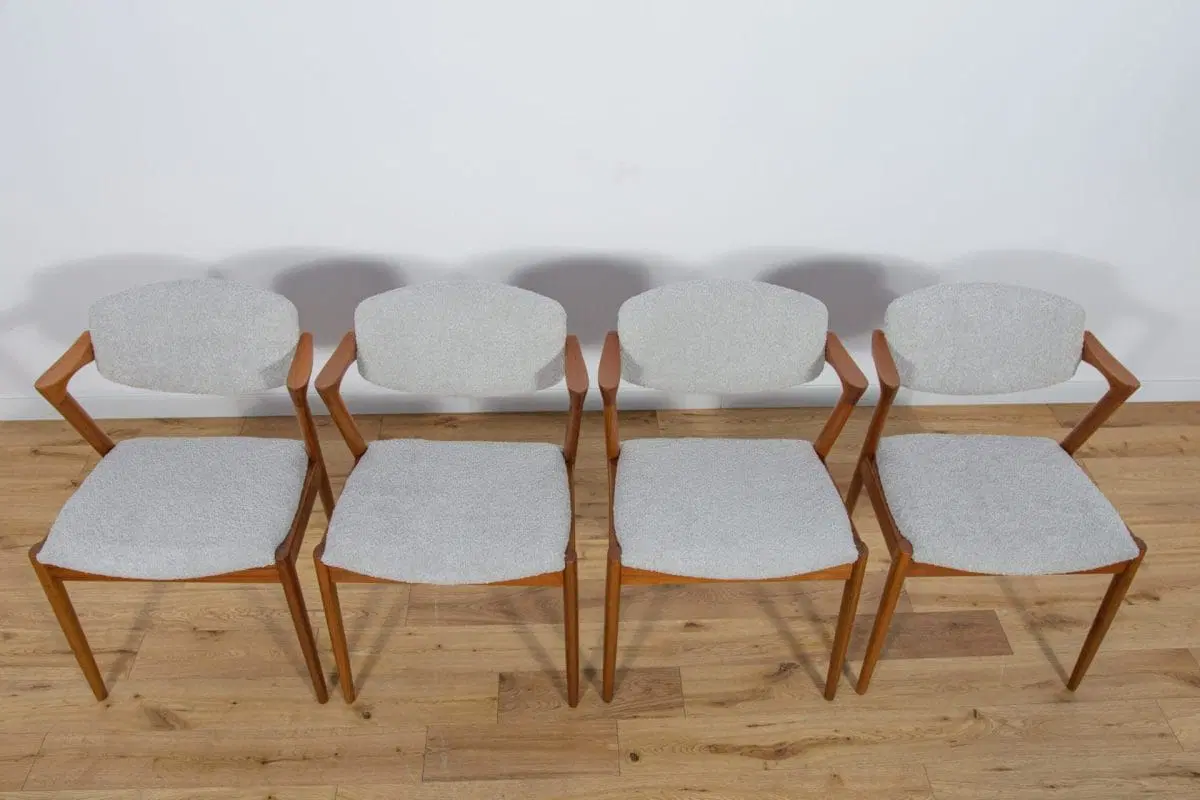 A set of four chairs model 42 designed by Kai Kristiansen for the Danish manufacture Schou-Andersens Møbelfabrik in the 1960s. Frame made of teak. Completely restored. Wood has been cleaned of old coating, finished with quality Danish Oil. Foams replaced. Upholstered with a new, high-quality gray fabric typ boucle.