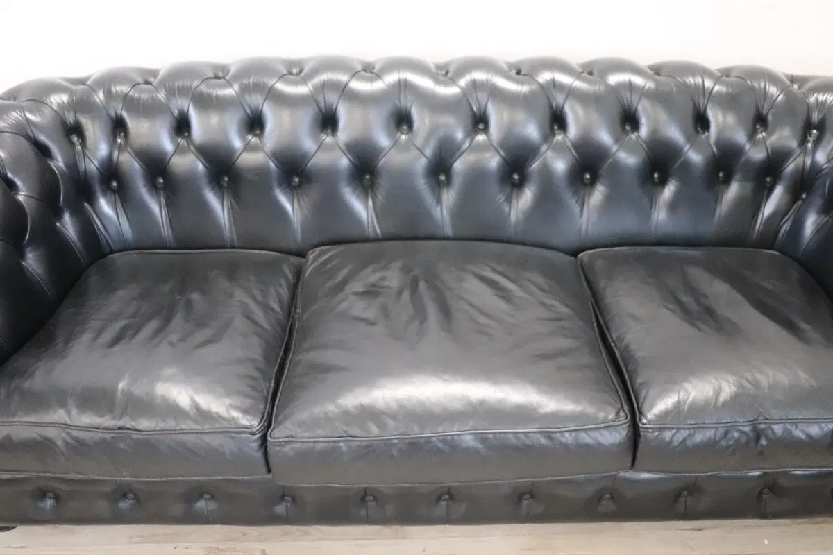 Set vintage divano e poltrona in pelle stile Chesterfield, anni ’80 circa